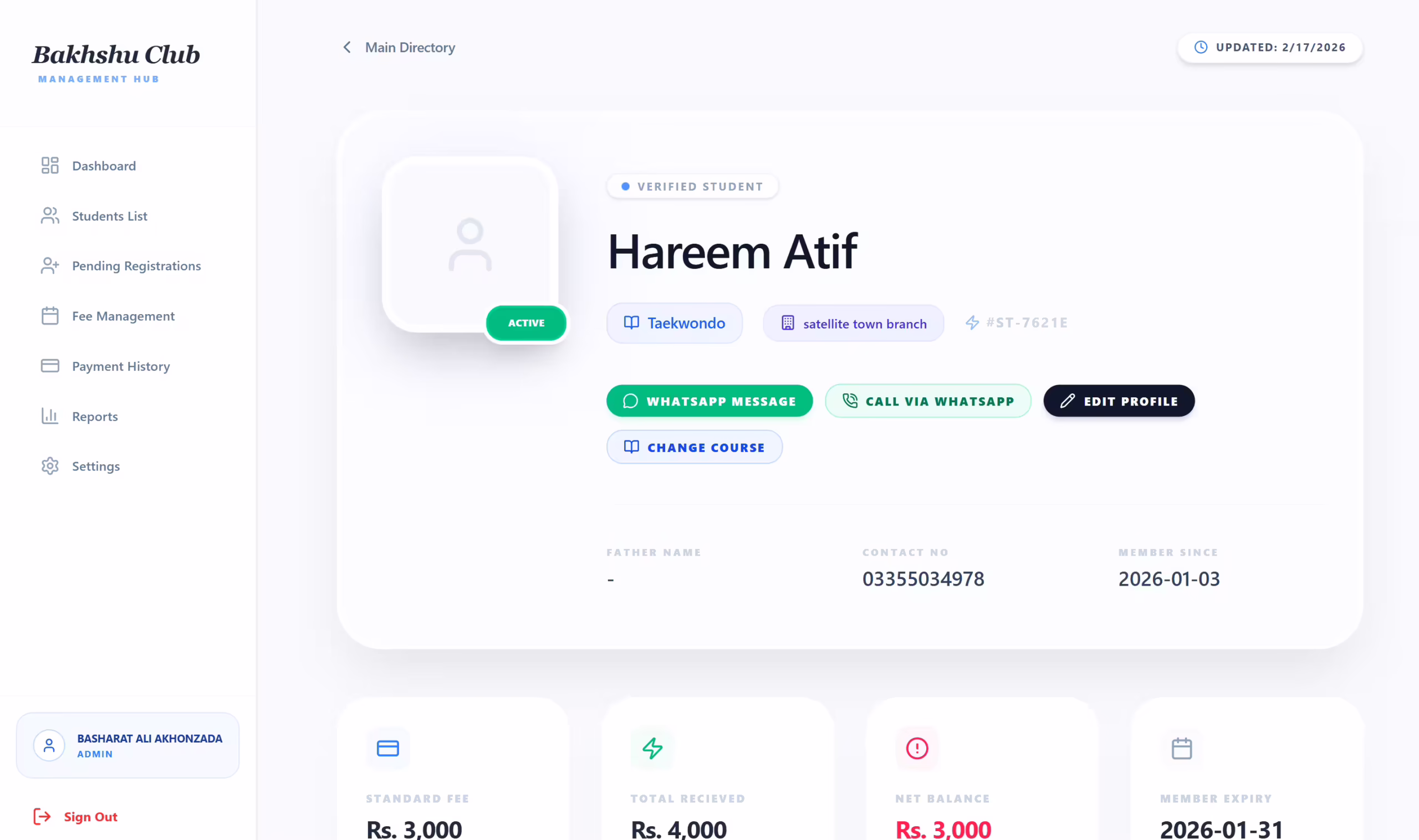 Create, update, and manage complete student profiles with admission and membership tracking.