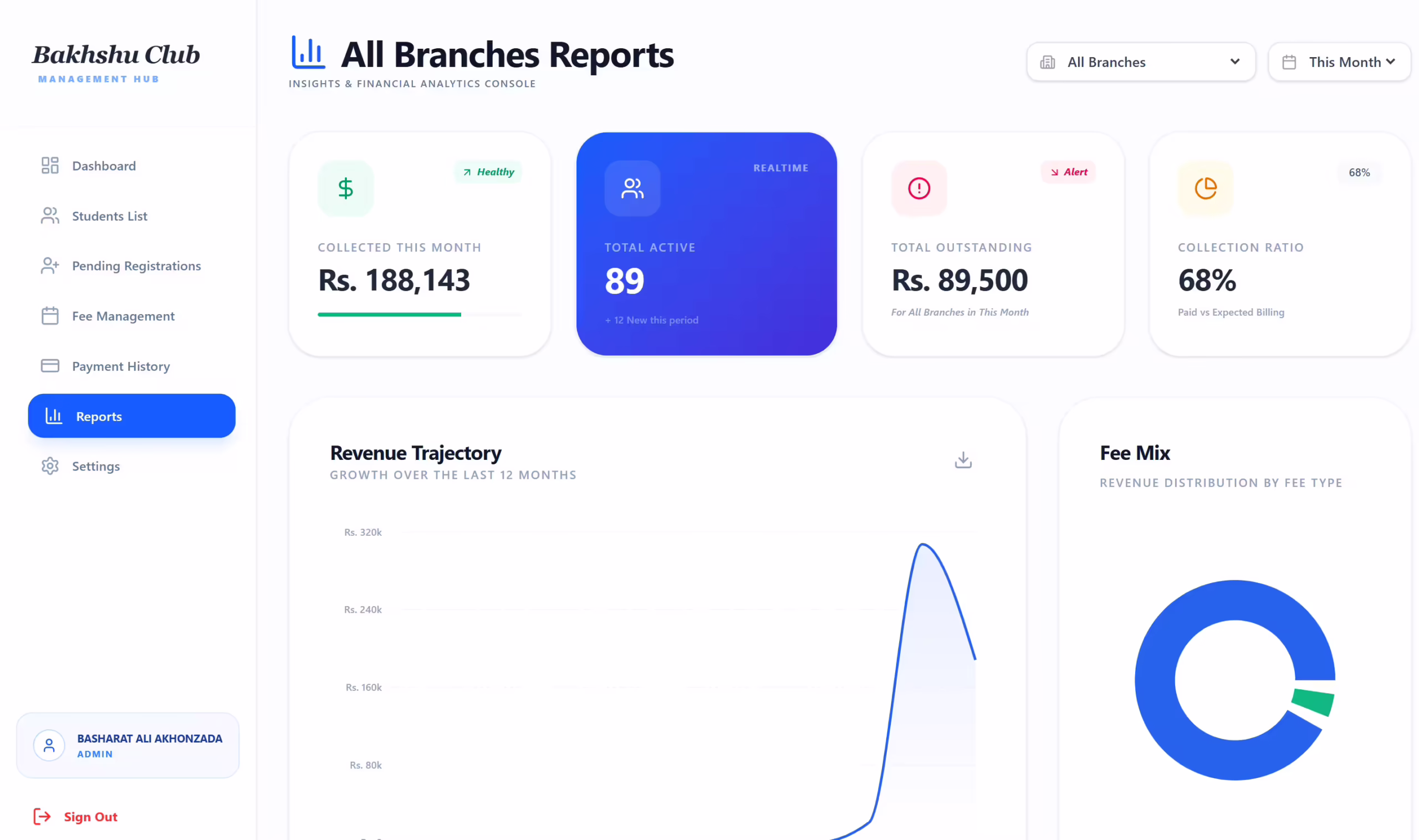 Get real-time insights into revenue, pending fees, student growth, and financial performance.